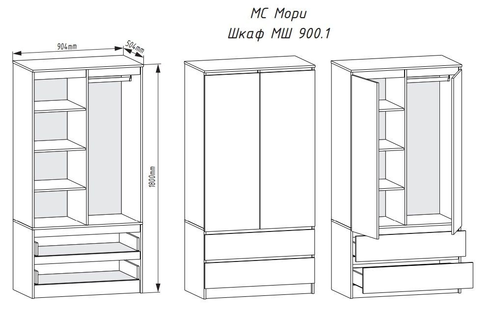 МОРИ МШ 900.1 Шкаф с 2-мя дв. и 2-мя ящ. (Сатин)